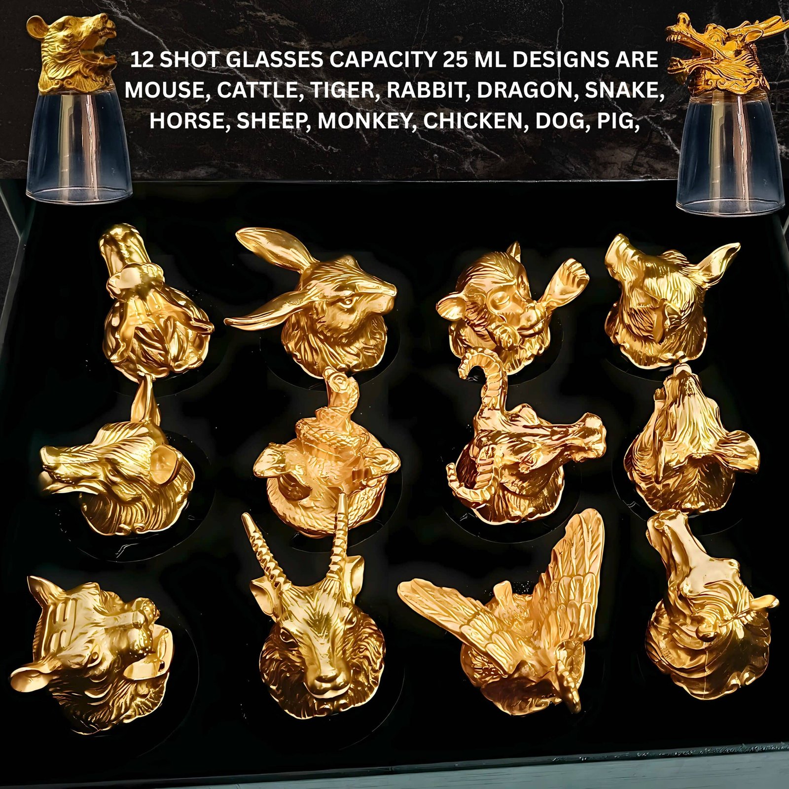 Elevate your barware collection with this luxurious set of 12 Zodiac Animal Head Shot Glasses. Each shot glass features a finely detailed golden metal animal topper representing the zodiac signs, paired with a durable clear glass base. With a capacity of 25 ml, these glasses are ideal for tequila, vodka, whiskey, and other spirits – making them perfect for house parties, get-togethers, or gifting.